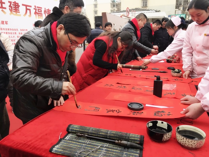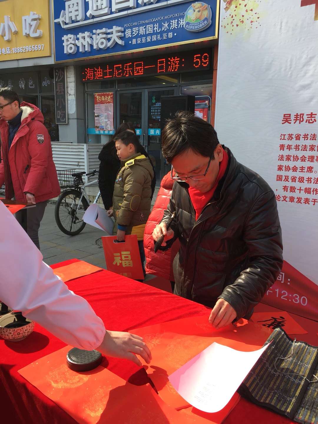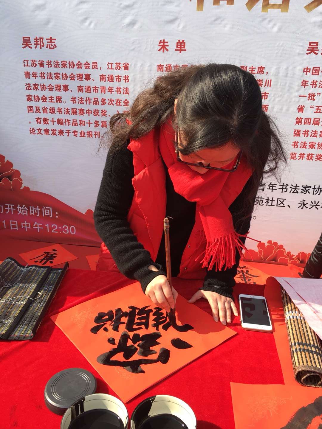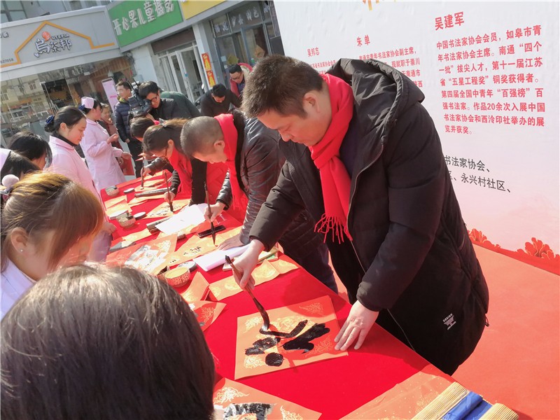 来自南通青年书法家协会的吴邦志先生、朱单女士、吴建军先生以及孙鑫先生现场挥毫泼墨,笔走龙蛇,行书,楷书,隶书等多种字体各显神韵,为社区居民送上了新年最美好的祝福。